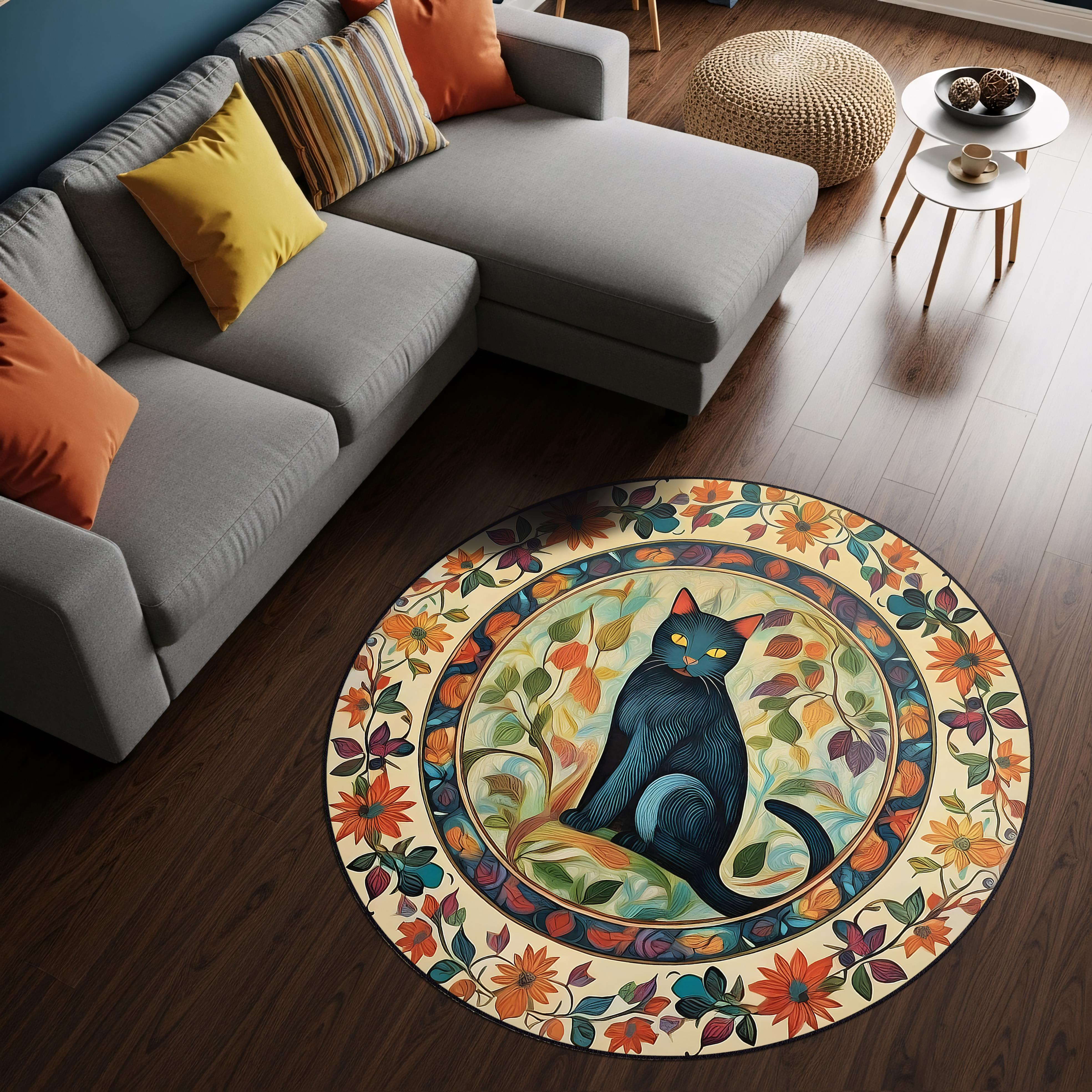 Yuvarlak Kedili Halı – Bohem Tarzda Çiçek ve Siyah Kedi Tasarımlı Yuvarlak Halı, Oturma Odası ve Yatak Odası Dekoratif Halı, Kaymaz Tabanlı, Makinede Yıkanabilir Modern Halı Modeli