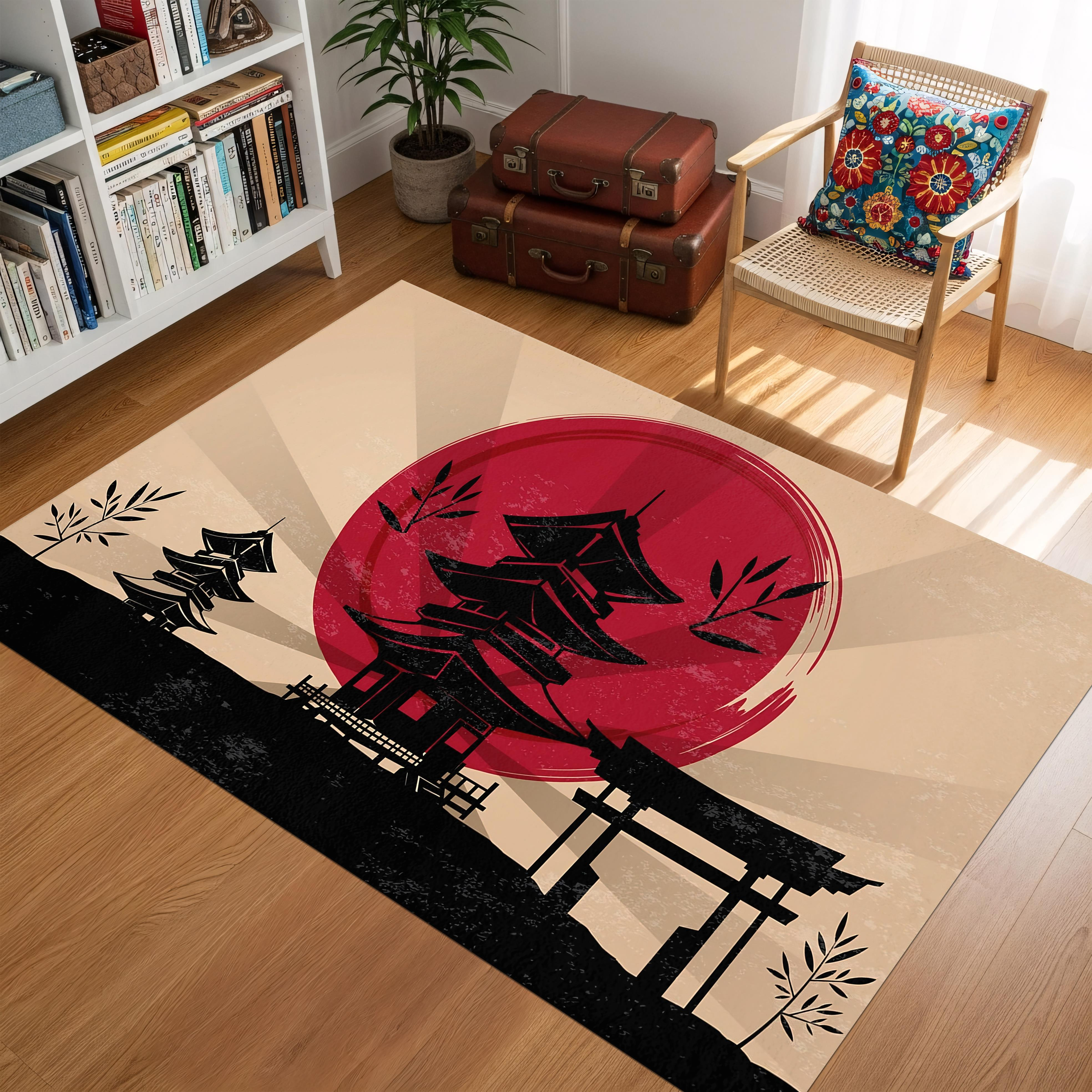 Japon Tapınağı Temalı Dekoratif Halı | Modern Asya Tarzı Halı | Minimalist Doğu Kültürü Halı | Kaymaz Tabanlı Yıkanabilir Halı