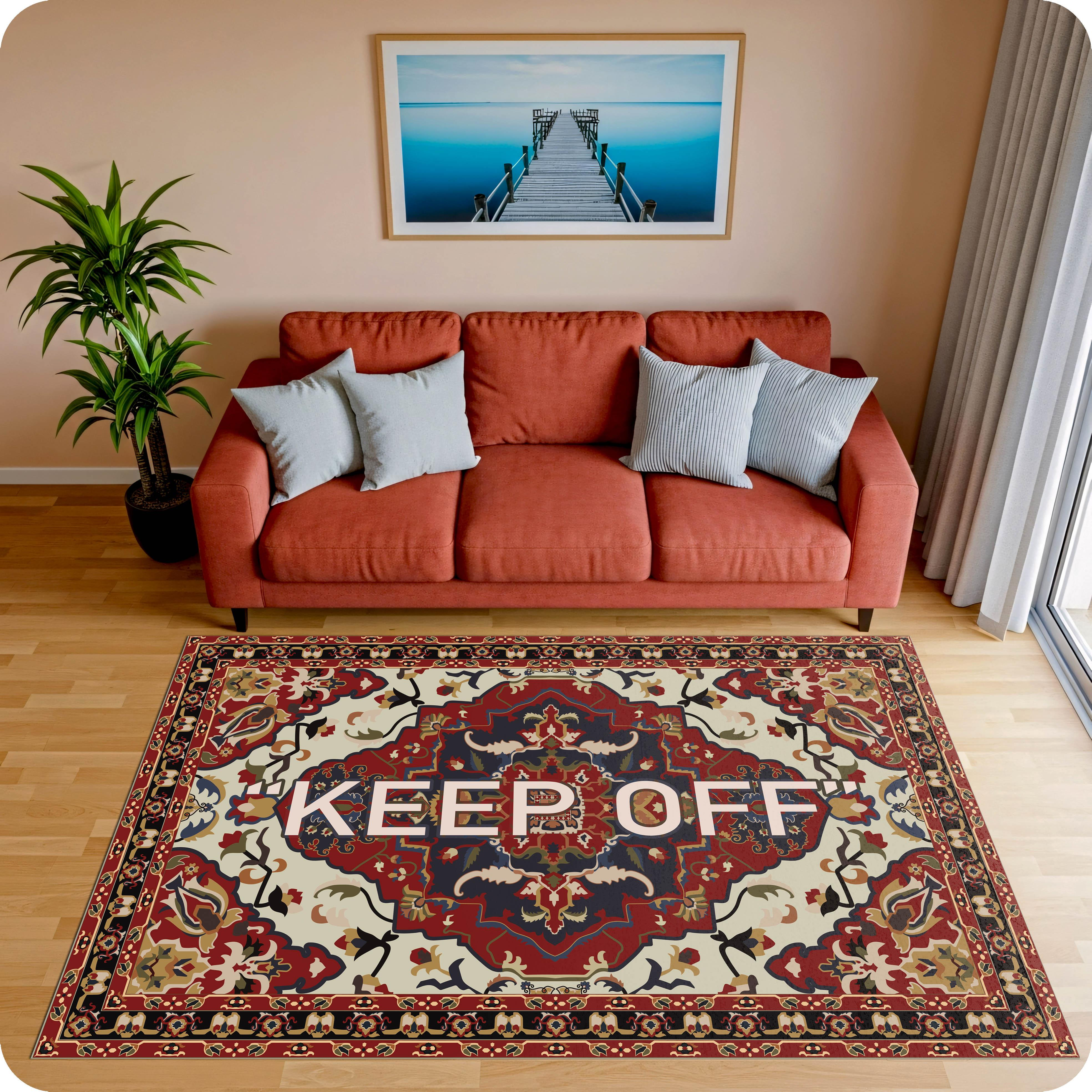 Kırmızı Lacivert ve Krem Desenli Keep Off Retro Halı – Klasik Motifli