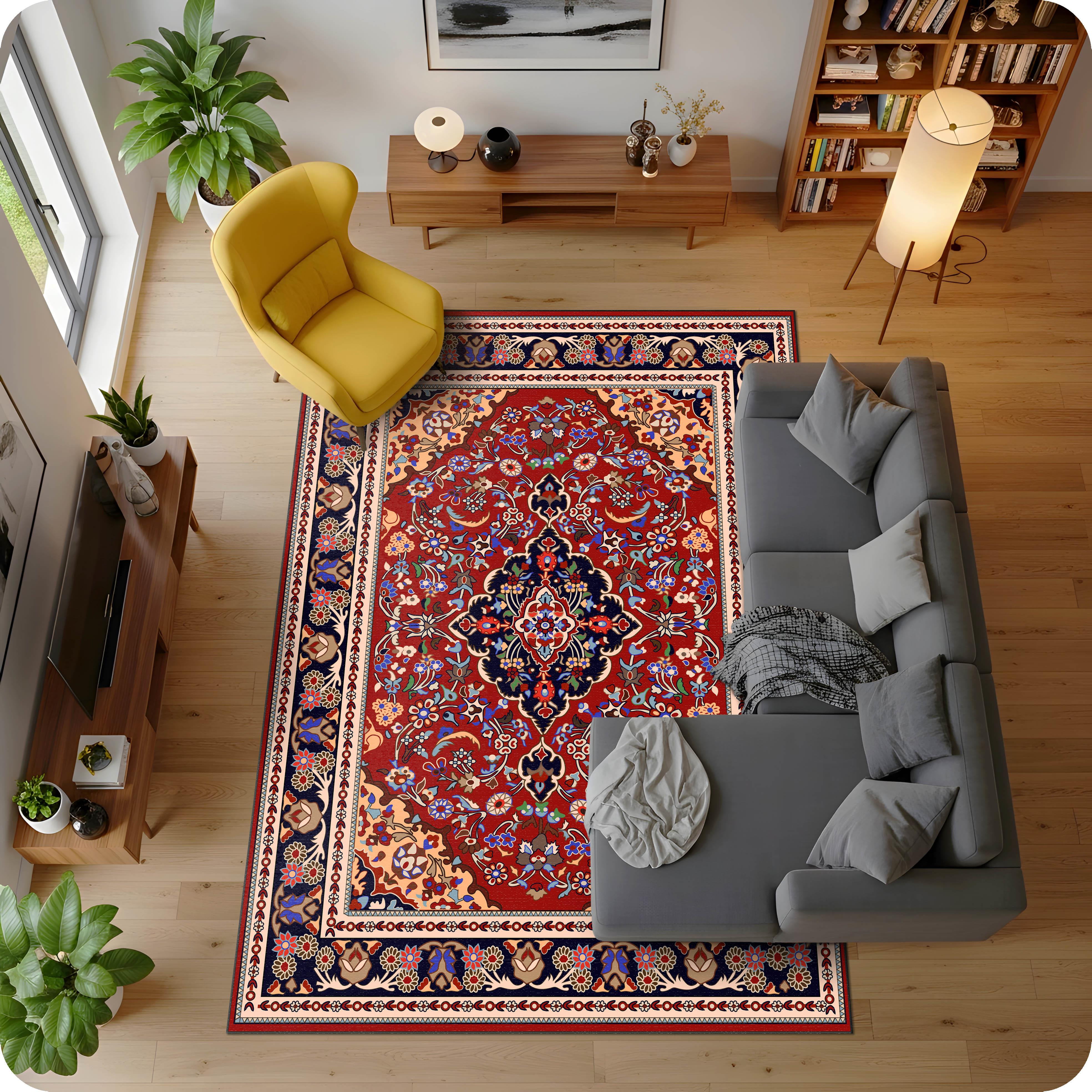 Kırmızı Zemin Lacivert Madalyonlu Klasik Çiçek Desenli Halı