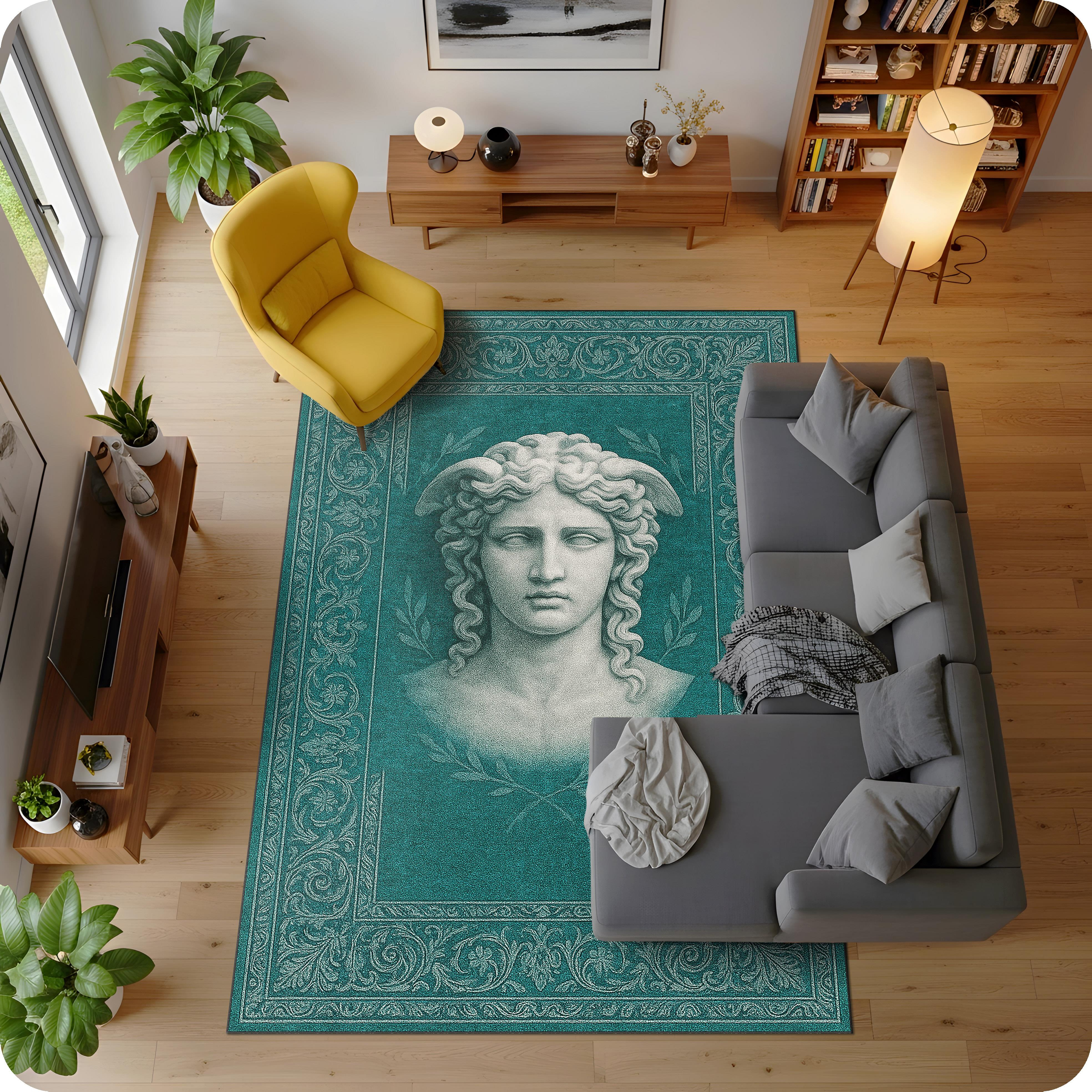 Medusa Büst Desenli Turkuaz Sanatsal Vintage Halı
