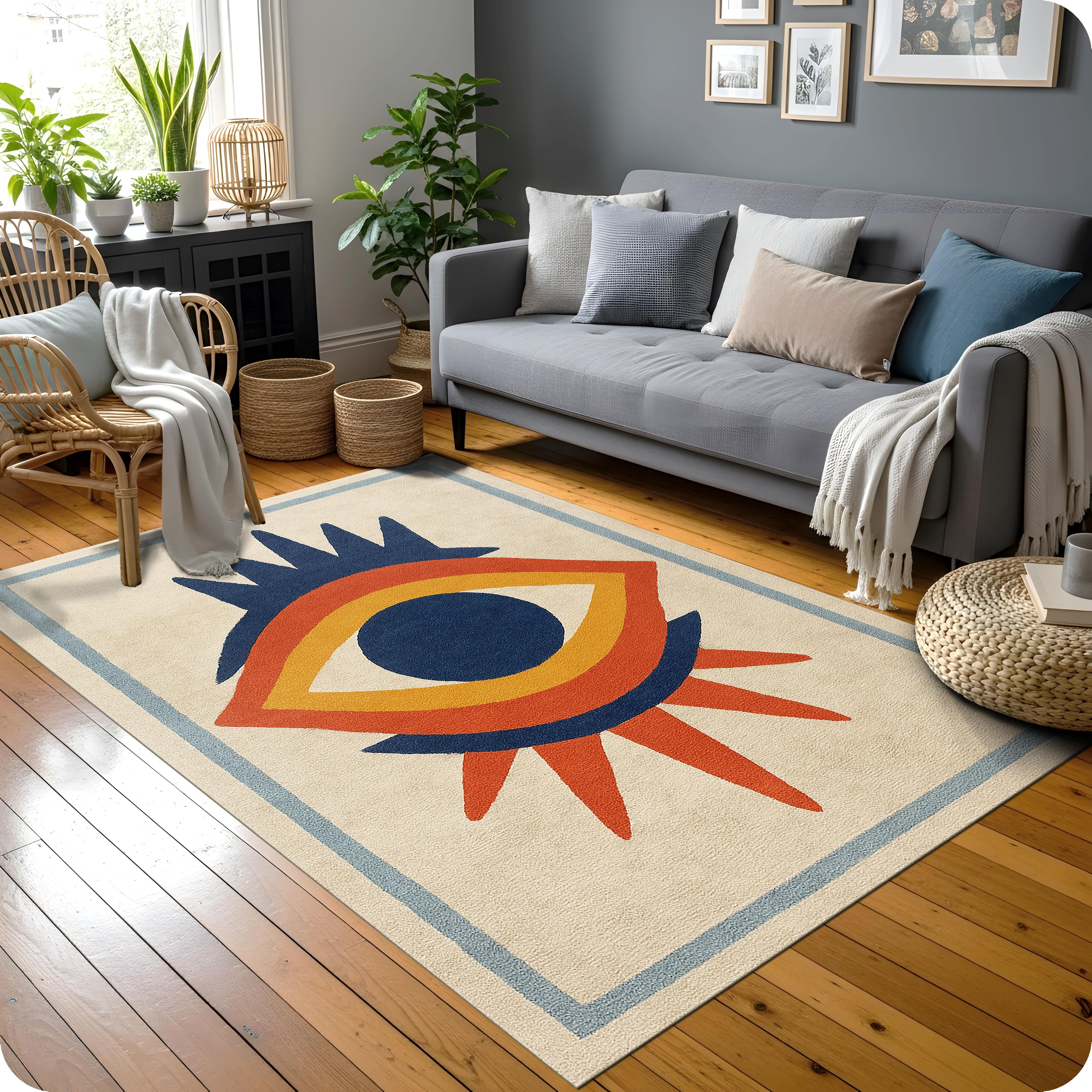Bej Zemin Üzerinde Renkli Göz Motifi ile Etnik ve Anlamlı Tasarım | Kaymaz Taban Seçeneği ile Yıkanabilir Dekoratif Halı | Lacivert, Turuncu ve Sarı Detaylı Geometrik Halı | Şık ve Koruyucu Desenli Halı