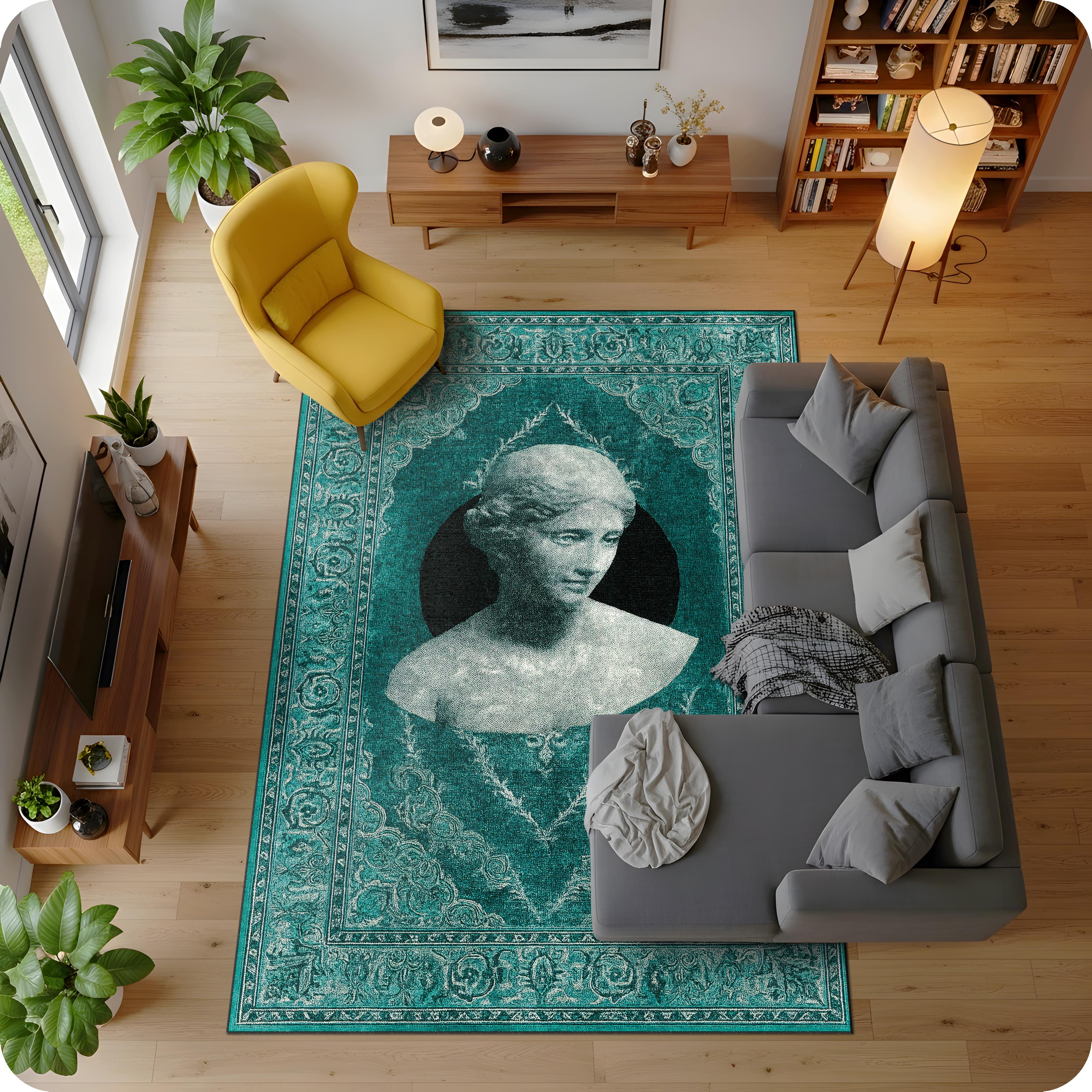 Klasik Heykel Figürlü Canlı Renkli Halı | Vintage ve Modern Tarzı Buluşturan Antik Tasarımlı Dekoratif Halı | Salon Halısı Kaymaz Taban Seçeneğiyle | Estetik Zemin Dekoru